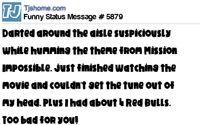 X is darted around the aisle suspiciously while humming the theme from Mission Impossible. just finished watching the movie and couldn't get the tune out of my head. Plus I had about 4 Red Bulls. Too bad for you!