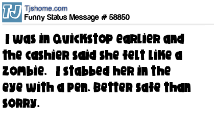 X is I was in Quickstop earlier and the cashier said she felt like a zombie. I stabbed her in the eye with a pen. Better safe than sorry.