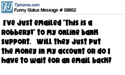 - # 193508 I just emailed "This is a robbery!" to my online bank. Will they just put the $$ in my account or do I have to wait for an email back?