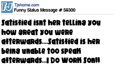 X says Satisfied isnt her telling you how great you were afterwards....Satisfied is her being unable too speak afterwards...I Do Work Son!!