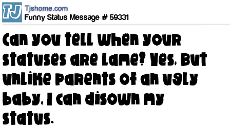 X is Can you tell when your statuses are lame? Yes, But unlike parents of an ugly baby, I can disown my status.