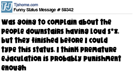 X Was going to complain about the people downstairs having loud s*x, but they finished before I could type this status, I think premature ejaculation is probably punishment enough
