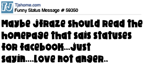 X is maybe jfraze should read the homepage that sais statuses for facebook...just sayin....Love not anger..