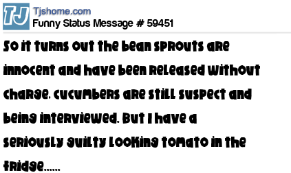 X So it turns out the bean sprouts are innocent and have been released without charge, cucumbers are still suspect and being interviewed. But I have a seriously guilty looking tomato in the fridge......