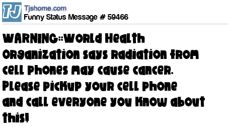 - # 59450 WARNING::World Health Organization says radiation from cell phones may cause cancer. Please text everyone you know about this.