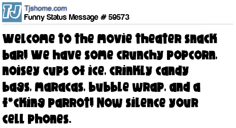 X Welcome to the movie theater snack bar! We have some crunchy popcorn, noisey cups of ice, crinkly candy bags, maracas, bubble wrap, and a f*cking parrot! Now silence your cell phones.