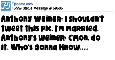 X Anthony Weiner: I shouldn't tweet this pic. I'm married. Anthony's weiner: C'mon, do it. Who's gonna know.....