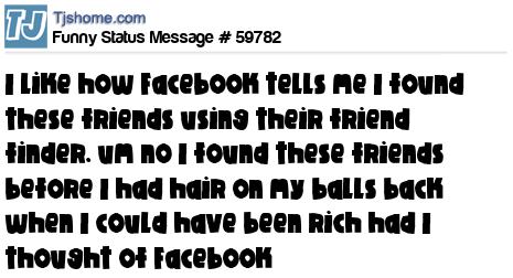 X I like how Facebook tells me I found these friends using their friend finder. um no I found these friends before I had hair on my balls back when I could have been rich had I thought of Facebook