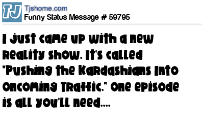 X I just came up with a new reality show. It's called "Pushing the Kardashians Into Oncoming Traffic." One episode is all you'll need....