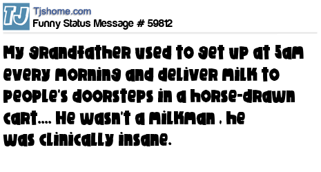 X says My grandfather used to get up at 5am every morning and deliver milk to people's doorsteps in a horse-drawn cart.... He wasn't a milkman , he was clinically insane.