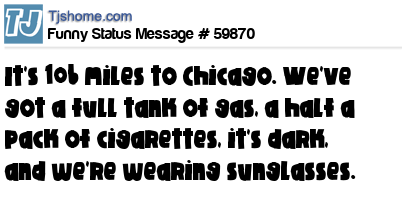 X It's 106 miles to Chicago. We've got a full tank of gas, a half a pack of cigarettes, it's dark, and we're wearing sunglasses.