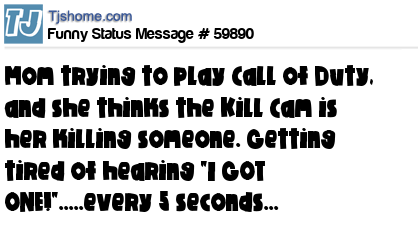 X is Mom trying to play Call of Duty, and she thinks the Kill Cam is her killing someone. Getting tired of hearing "I GOT ONE!".....every 5 seconds...