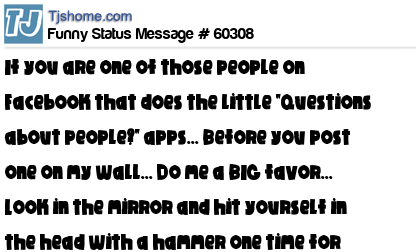 X If you are one of those people on Facebook that does the little "Questions about people?" apps... Before you post one on my wall... Do me a BIG favor... Look in the mirror and hit yourself in the head with a hammer one time for me... Thanks!!! /:)