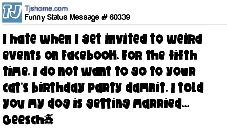 - # 160691 hates it when I get invited to weird events on Facebook. For the fifth time, I do not want to go to your cat's birthday party, FREAK!...My dog is getting married