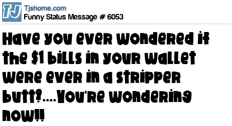 - # 28376 Have you ever wondered if the one dollar bills in your wallet were ever in a stripper's butt crack? If not, you're wondering now. Have a nice day ..