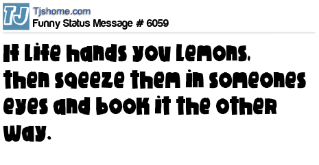 - # 7487 Sometimes when life hands you lemons you just need to take those lemons and throw them back in life's face and say "How dare you!!! Don't come back here till you have some oranges or at least a pretty good sized grapefruit!"