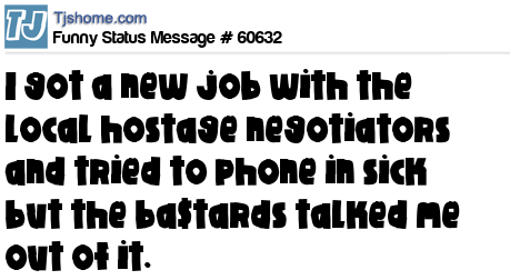X I got a new job with the local hostage negotiators and tried to phone in sick but the ba$tards talked me out of it.