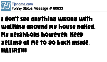 X I don't see anything wrong with walking around my house naked. My neighbors however, keep yelling at me to go back inside. HATERS!!!
