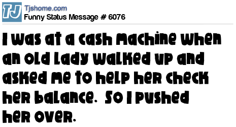 - # 125886 I was at the bank machine the other day and an old lady approached and asked me to help check her balance.....So I pushed her.