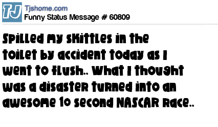 - # 74455 ...I just dropped a handful of skittles in the toilet and flushed..... it was like watching a Nascar race @ Bristol