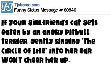 X If your girlfriend's cat gets eaten by an angry pitbull terrier, gently singing "The Circle of Life" into her ear WON'T cheer her up.