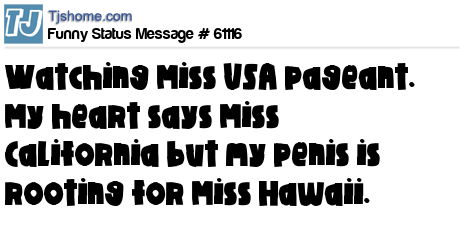 X is Watching Miss USA pageant. My heart says Miss California but my penis is rooting for Miss Hawaii.