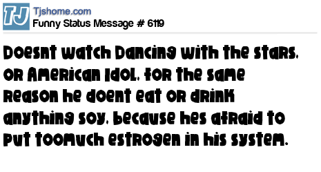X Doesnt watch Dancing with the stars, or American Idol, for the same reason he doent eat or drink anything soy, because hes afraid to put toomuch estrogen in his system.