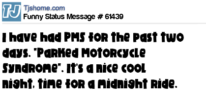 X is I have had PMS for the past two days. "Parked Motorcycle Syndrome". It's a nice cool night, time for a midnight ride.