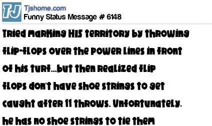 X tried marking HIS territory by throwing flip-flops over the power lines in front of his turf...but then realized flip flops don't have shoe strings to get caught after 11 throws. Unfortunately, he has no shoe strings to tie them together since ...he was w