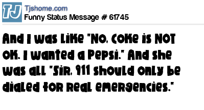 X And I was like "No, Coke is NOT ok. I wanted a Pepsi." And she was all "Sir, 911 should only be dialed for real emergencies."
