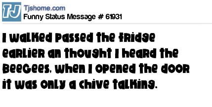 - # 26988 walked past the fridge last night and thought she heard two onions singing a Bee Gees song but when she opened the fridge door it was just chives talking.