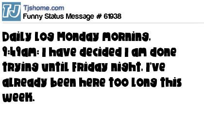 X is Daily log Monday morning, 9:49am: I have decided I am done trying until Friday night, I've already been here too long this week.