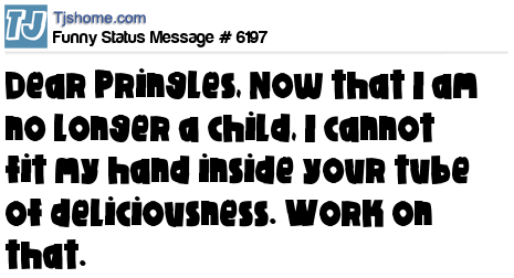 - # 164642 Dear Pringles, I'm no longer a child and cannot fit my hand inside your tubes of deliciousness. Sincerely, Everyone over 8 years old.