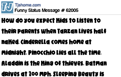 - # 54258 Dear Parents, How do you expect kids to listen to you when: Tarzan lives half naked. Cinderella comes back at midnight. Pinocchio lies all the time. Aladdin is the king of thieves. Batman drives at 320km/h. Sleeping beauty is lazy. Snow white sleeps with