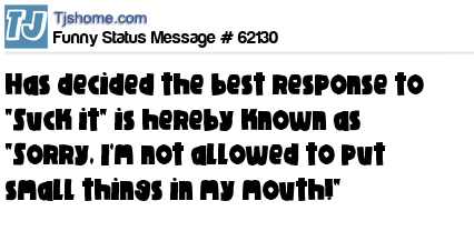 X says has decided the best response to "Suck it" is hereby known as "Sorry, I'm not allowed to put small things in my mouth!"