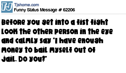 X Before you get into a fist fight look the other person in the eye and calmly say "I have enough money to bail myself out of jail. Do you?"