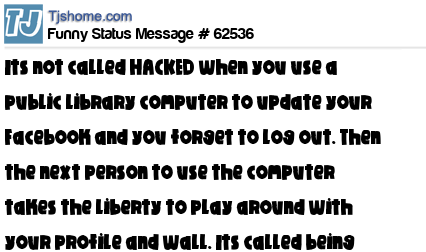X is Its not called HACKED when you use a public library computer to update your Facebook and you forget to log out. Then the next person to use the computer takes the liberty to play around with your profile and wall. Its called being stupid and careless.
