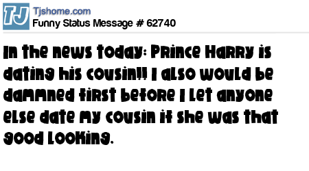 X In the news today: Prince Harry is dating his cousin!! I also would be dammned first before I let anyone else date my cousin if she was that good looking.