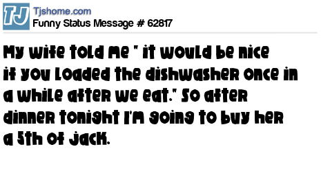 X is My wife told me " it would be nice if you loaded the dishwasher once in a while after we eat." So after dinner tonight I'm going to buy her a 5th of jack.