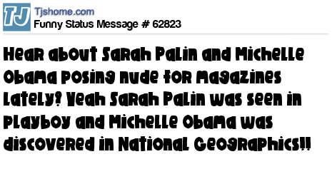 X Hear about Sarah Palin and Michelle Obama posing nude for magazines lately? Yeah Sarah Palin was seen in playboy and Michelle Obama was discovered in National Geographics!!