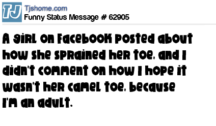 - # 86348 A girl on Facebook posted about how she sprained her toe, and I didn't comment on how I hope it wasn't her camel toe, because I'm an adult. I sent it in a pvt message ;~)