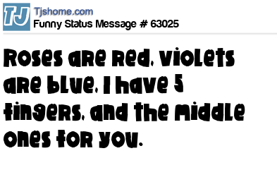 - # 23485 Roses are red. Violets are blue. She has 5 fingers and the middle one's for you.