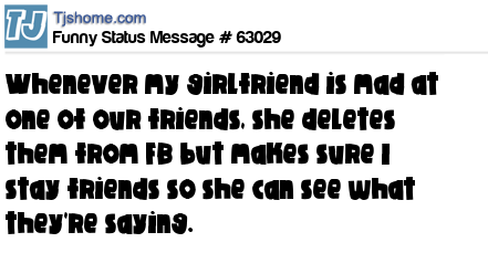 X Whenever my girlfriend is mad at one of our friends, she deletes them from FB but makes sure I stay friends so she can see what they're saying.