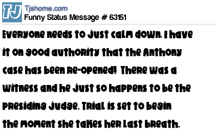 X Everyone needs to just calm down, I have it on good authority that the Anthony case has been re-opened! There was a witness and he just so happens to be the presiding judge. Trial is set to begin the moment she takes her last breath.
