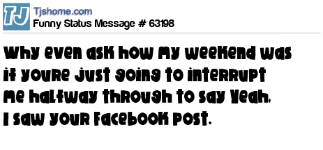- # 69374 Why even ask how my weekend was if you're just going to interrupt me halfway through to say "Yeah, I saw your Facebook post."