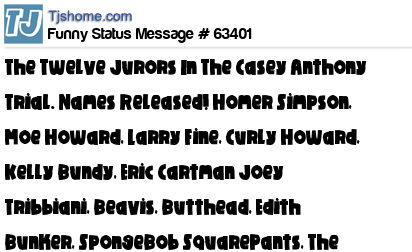 X The Twelve Jurors In The Casey Anthony Trial. Names Released! Homer Simpson, Moe Howard, Larry Fine, Curly Howard, Kelly Bundy, Eric Cartman Joey Tribbiani, Beavis, Butthead, Edith Bunker, SpongeBob SquarePants, The Coyote.