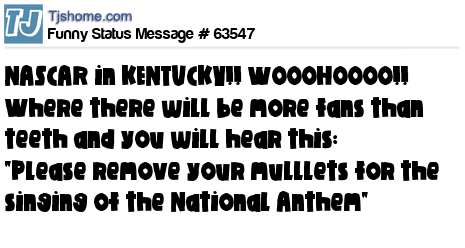 X is NASCAR in KENTUCKY!! WOOOHOOOO!! Where there will be more fans than teeth and you will hear this: "Please remove your mulllets for the singing of the National Anthem"