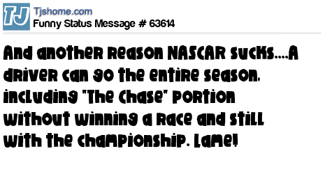 X says And another reason NASCAR sucks....A driver can go the entire season, including "The Chase" portion without winning a race and still with the championship. Lame!