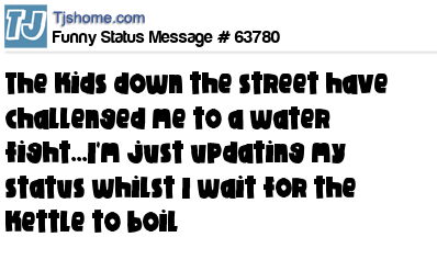 X says The kids down the street have challenged me to a water fight...I'm just updating my status whilst I wait for the kettle to boil