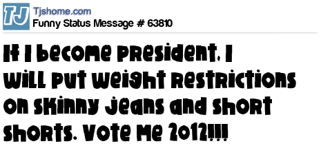X If I become president, I will put weight restrictions on skinny jeans and short shorts. Vote Me 2012!!!
